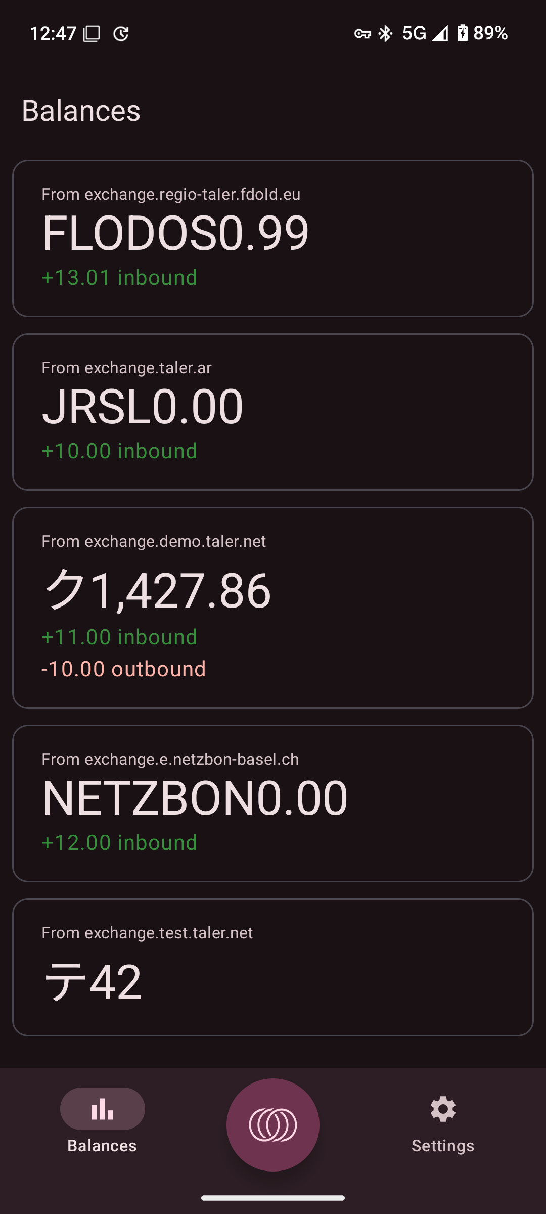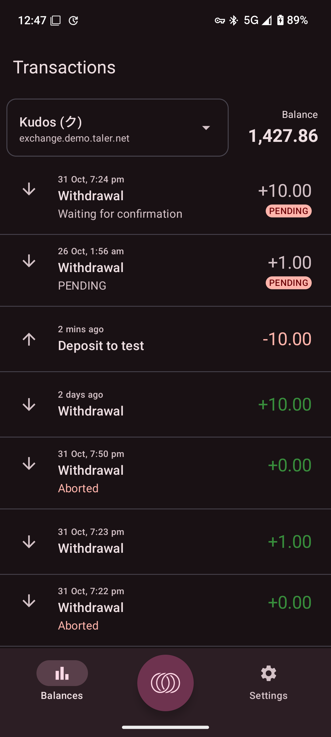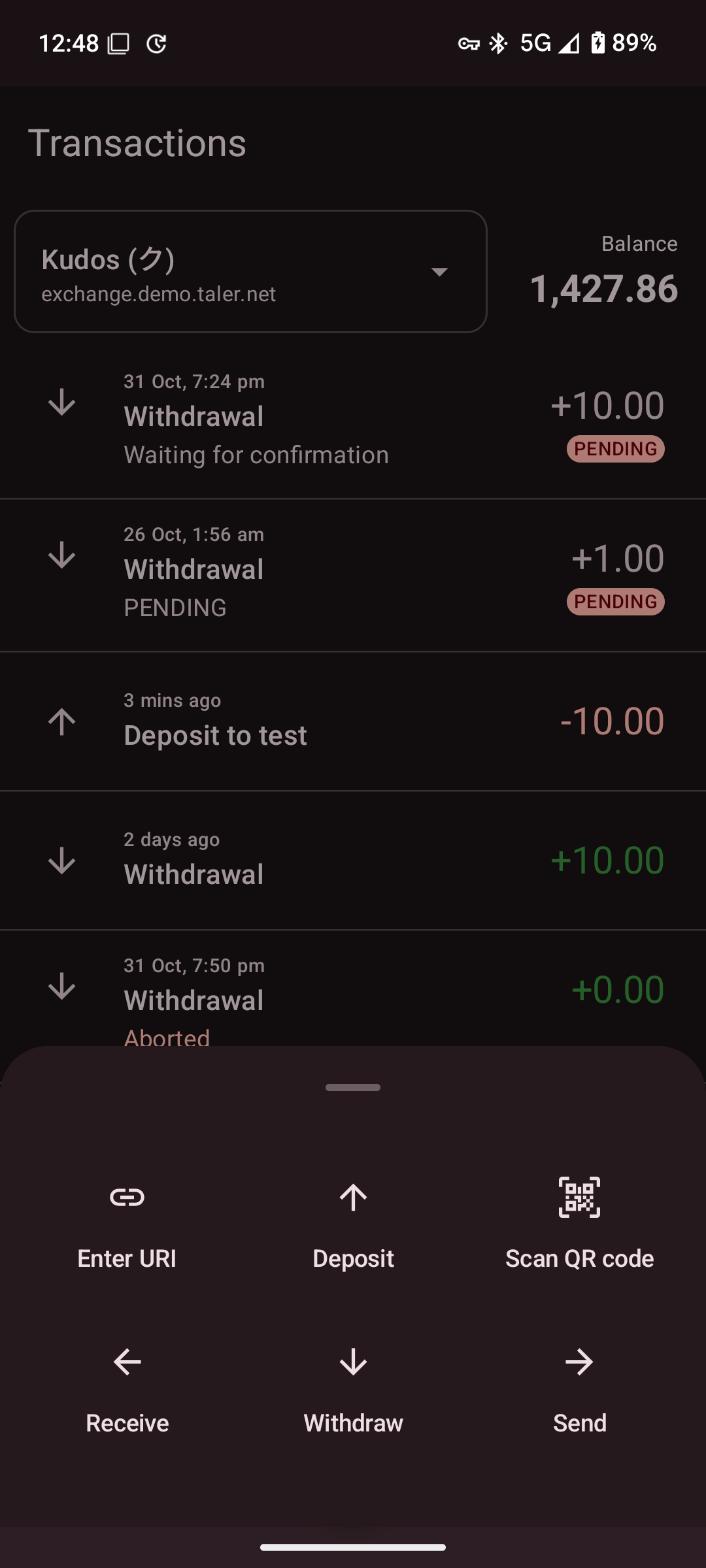 The initial interaction with the "Taler button" can be seen in this video. There are two possible interactions: a) If the user is clicked, a bottom sheet will appear with the main actions (deposit, withdraw, send, receive, scan QR, etc.) b) a) If the button is dragged up and then dropped, the QR scanner will open. b) If the button is dragged up and then down, the action will cancel and nothing will happen. The button will wiggle twice and show the "Actions" tooltip at every launch _until_ the user interacts with it. |