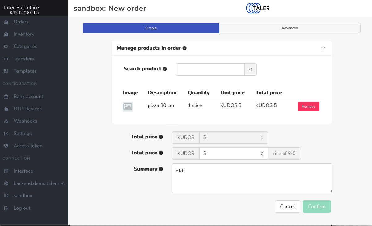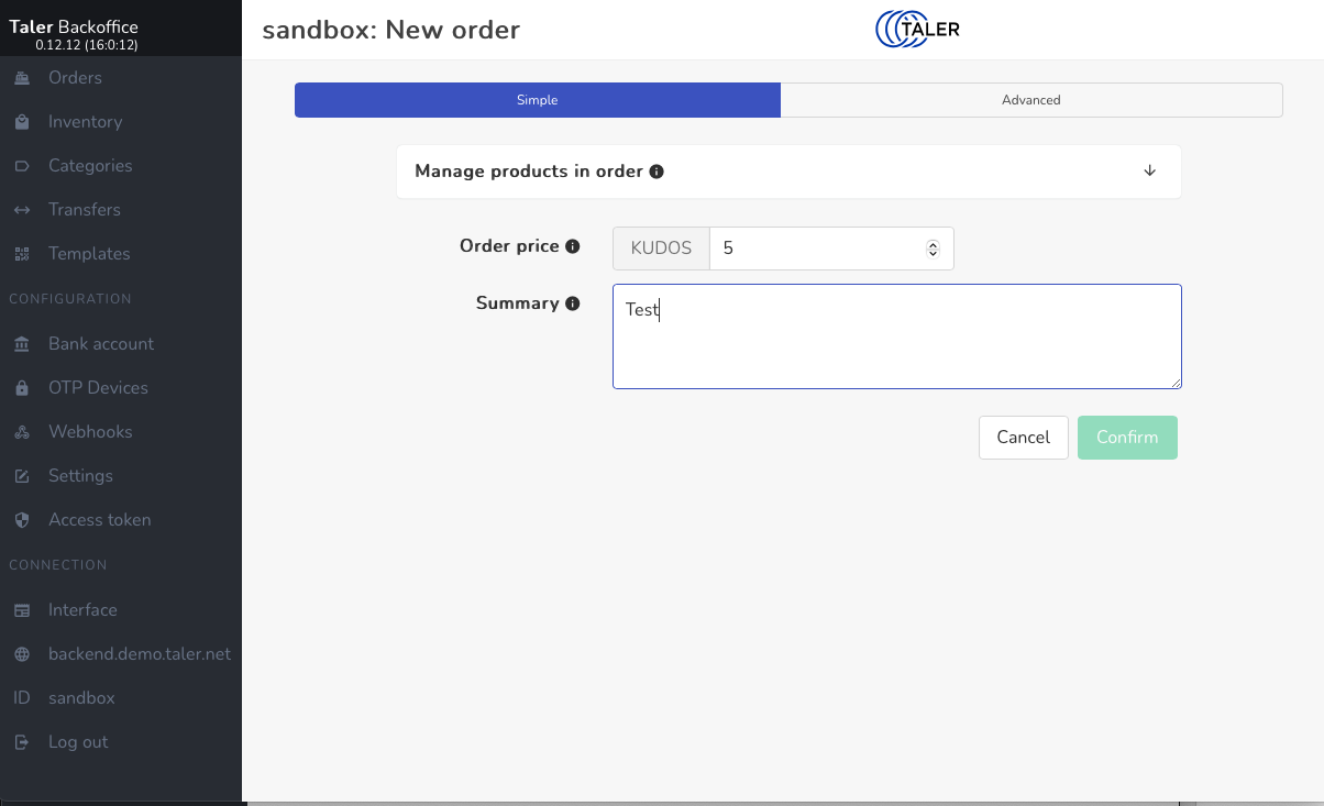 | Steps To Reproduce | In the Sandbox for the merchant backend https://backend.demo.taler.net/instances/sandbox/ Token : sandbox Add a new order. Try to validate. | ||||