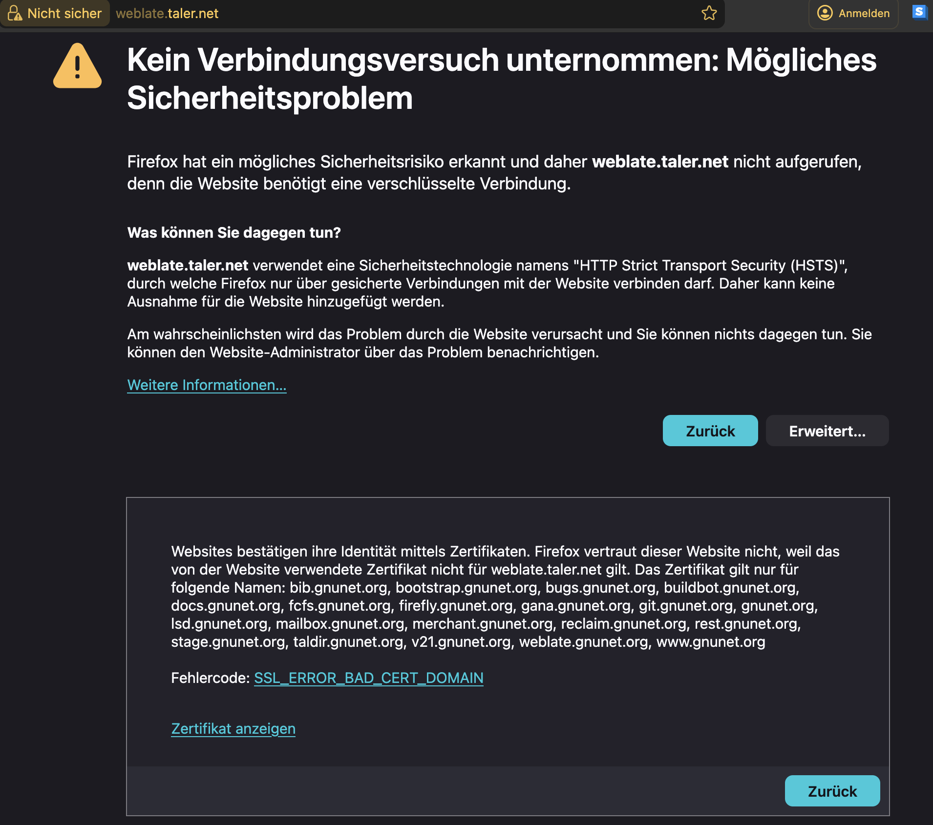 Yo, cert looks good now (queried without DNS; propagation might take time): hernani@clementine:~$ echo | openssl s_client -connect 193.5.87.218:443 -servername weblate.taler.net 2>/dev/null | openssl x509 -noout -subject -issuer -dates subject=CN = weblate.taler.net issuer=C = US, O = Let's Encrypt, CN = E7 notBefore=Dec 4 10:13:54 2025 GMT notAfter=Mar 4 10:13:53 2026 GMT |