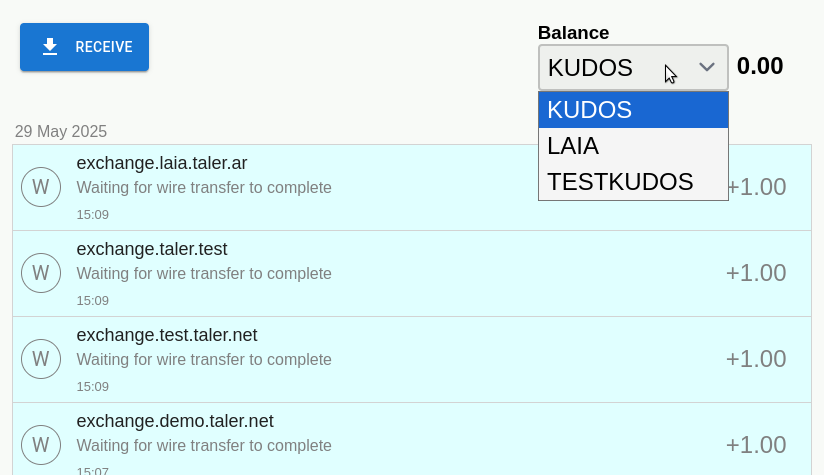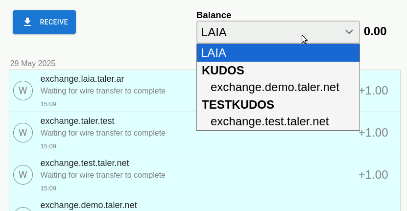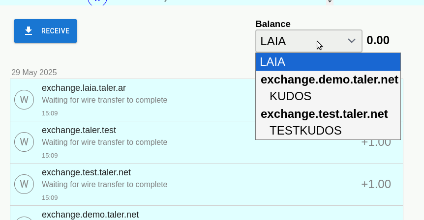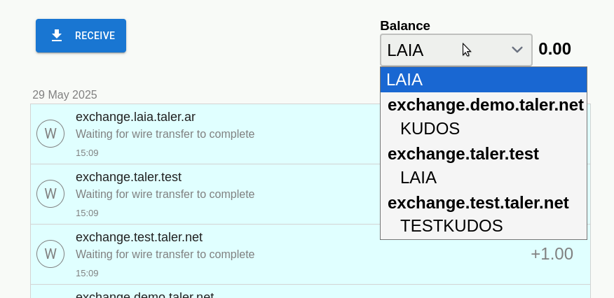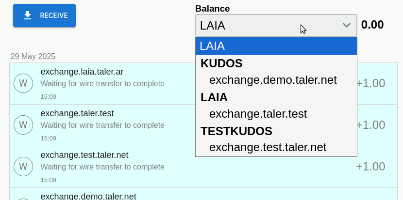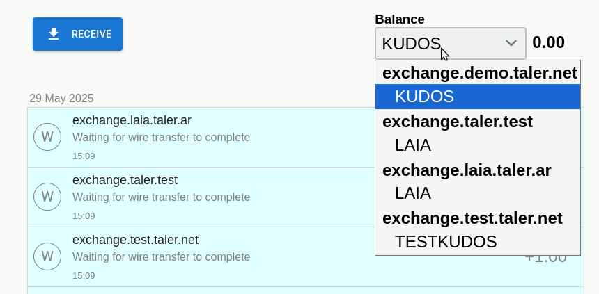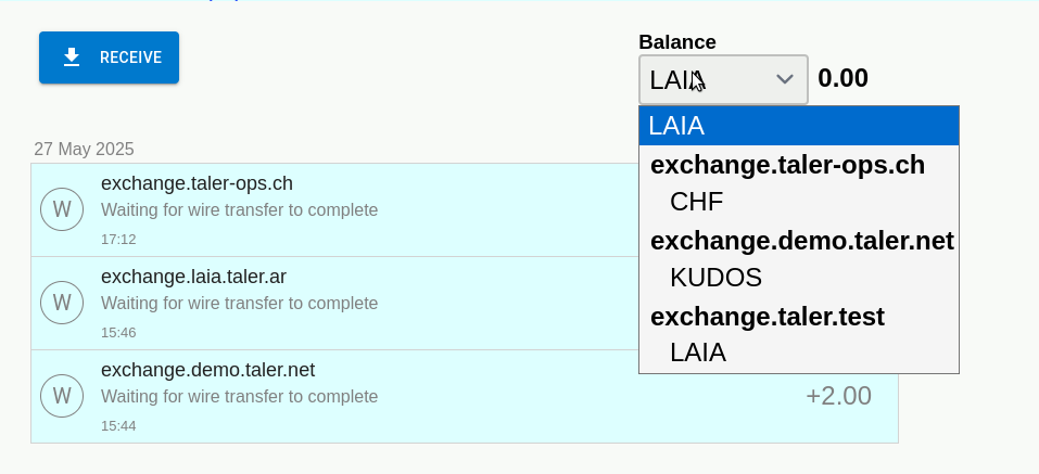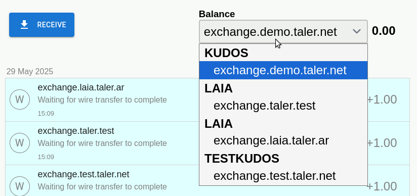 I don't think exposing here a list of exchanges is a good idea. The dropdown is about balance scopes https://docs.taler.net/design-documents/035-regional-currencies.html The exchange URL is only shown when the transactions and money is not REAL money (an exchange need to be approved by an authority to be able to be listed in the wallet as provider of official currency) |