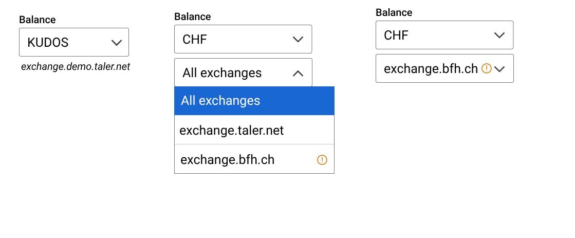 1) Only one exchange is available for selected currency 2) Possibility for difference views for user 3) Selected exchange is not trusted by developers. On icon hover, show hint "The developers of this wallet do not trust this service provider." picture from penpot https://penpot.taler.net/#/workspace?team-id=826af720-982c-8096-8006-0dbdd6a758c1&file-id=29e68e1b-4b36-81a2-8006-436e5512dd51&page-id=29e68e1b-4b36-81a2-8006-436e5512dd52 I think separating currencies and exchanges to different dropdowns might be clearer for users |