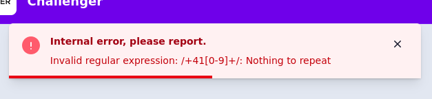 This is a regular expression configuration from the server, error reporting can be better. Chrome show better info than Firefox. Config: "restrictions": { "phone": { "hint": "Swiss number required", "regex": "+41[0-9]+" } }, |