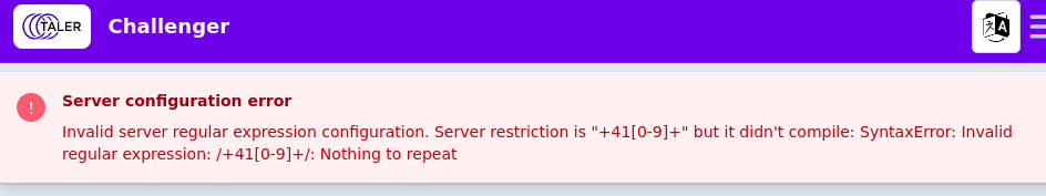 updating the challenger configuration to "regex":"\\+41[0-9]+" worked for me |