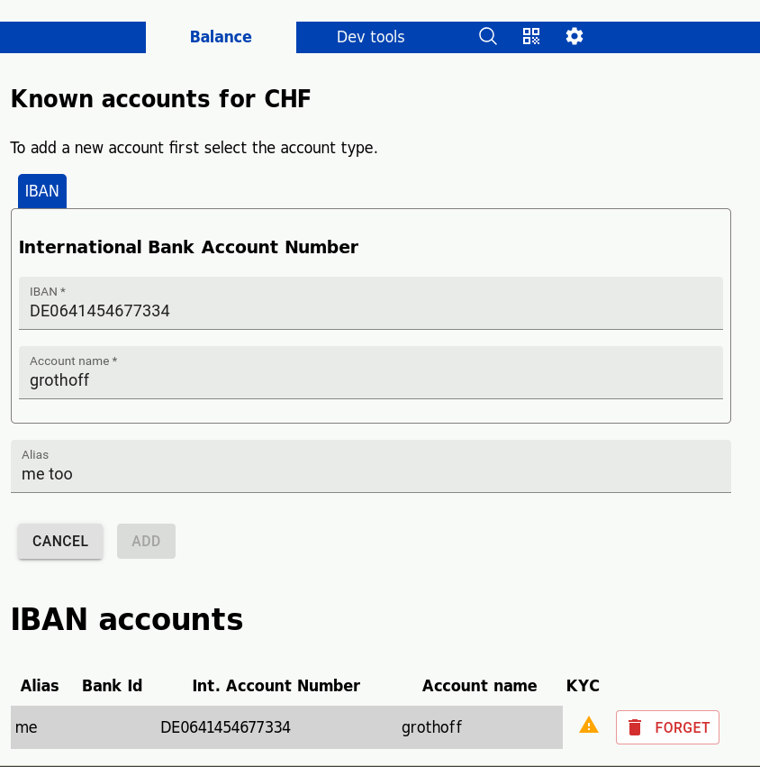 | Description | When trying to do the transfer a 2nd time without using the existing account that was broken (see previous report), there are two issues: 1) the "add" button remains greyed out, even though I even used a different alias. 2) the list of IBAN accounts below shows the "KYC" with an alert, even though this exchange has KYC *disabled*, so there cannot be a problem. 3) I cannot select from the list of existing bank accounts, even though they are shown. | ||||