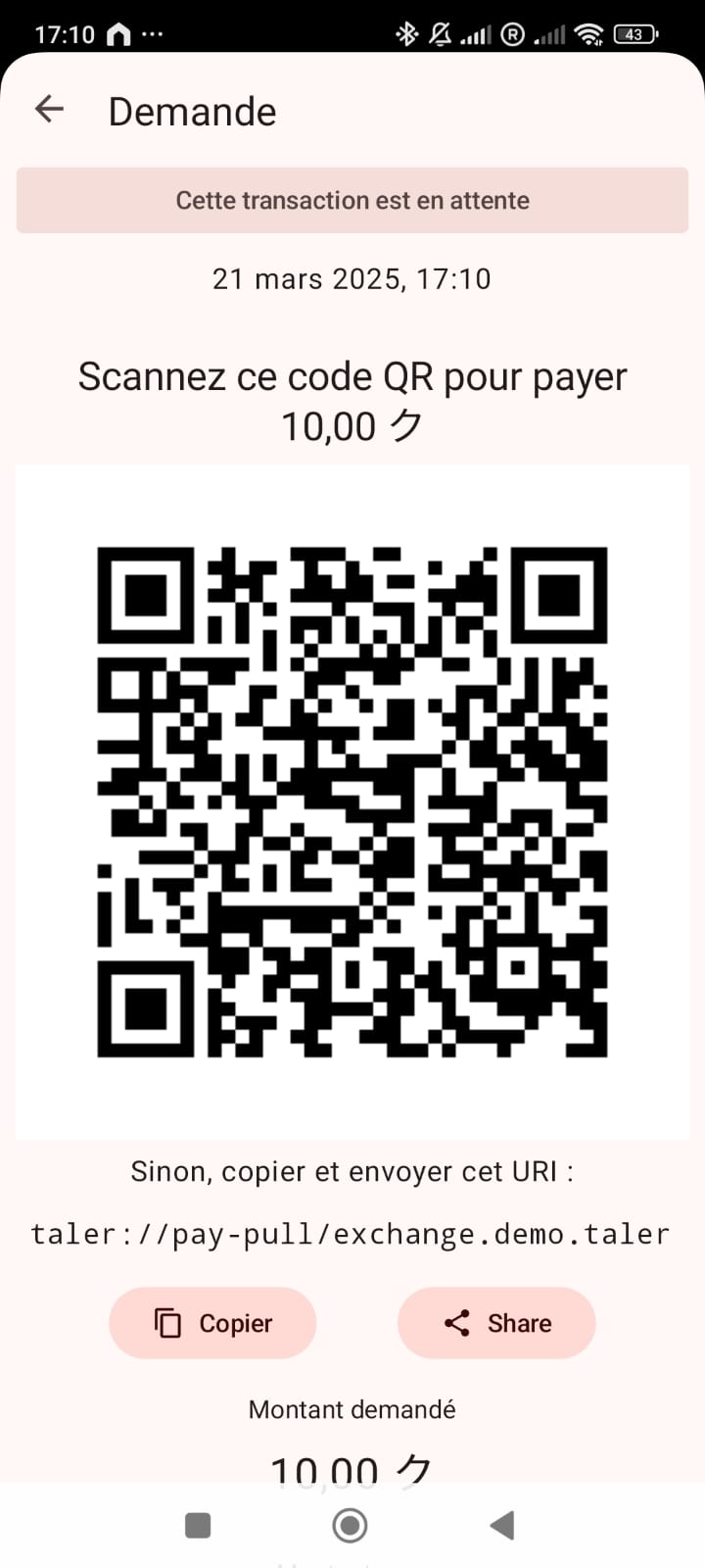@Emmanuel, please update your wallet app. on iOS we have v14.5 (wallet corev14.11) since a few days. Android wallet got an update, too. Then, please be so kind and play through the testing again. There might be differences. In any case: Thanks for the remarks, are you going to integrate them in Weblate? - a message box with two links : Annuler or Annuler. This was rectified a long time ago. Are there again two identical button texts or not? https://weblate.taler.net/translate/gnu-taler/wallet-android/fr/?checksum=ab34f834259d97cb&q=annuler&sort_by=-priority%2Cposition#translations is the non-destructive abort "Cancel" which is in French "Annuler" and in German "Zurück" - whereas https://weblate.taler.net/translate/gnu-taler/wallet-android/fr/?checksum=7be3c5b33e80139f is the destructive abort "Abort" which is in French "Exécuter l'annulation" and in German "Abbruch ausführen". So, everything OK here. |