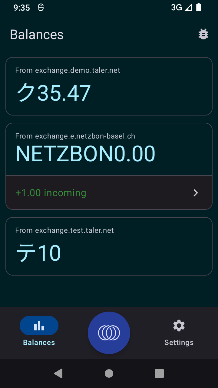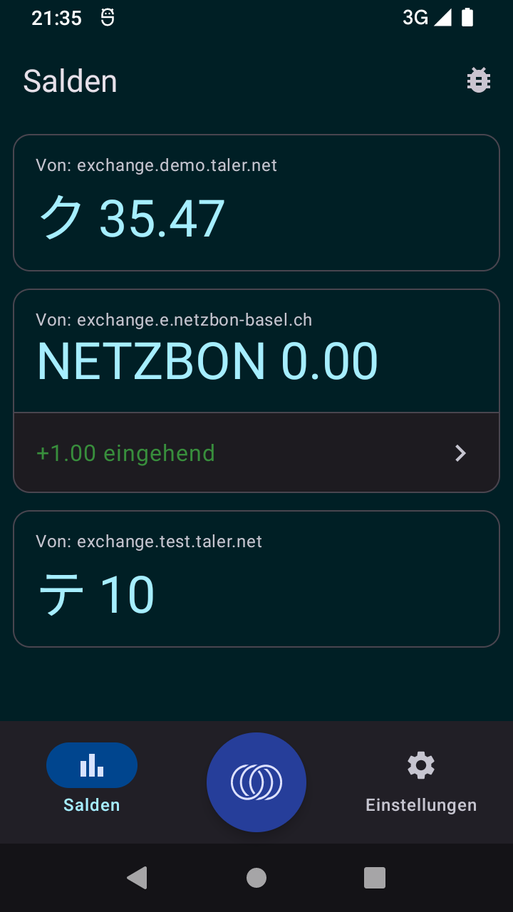 Eh, I'm sorry, but I'm not talking about the *title* of anything here. I'm talking about the button left of the action button with the Taler-logo. In your screenshots, that's labeled "Salden" and that button is not working. |
