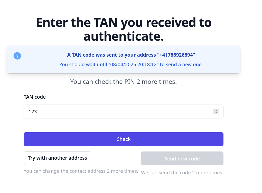 | Description | I didn't get my SMS TAN, wanted to diagnose it by sending it again, but the SPA doesn't even allow it (even though it should allow it up to 3x per number). There is even a button for it ("Send new code"), but it is always greyed out. Note that the hint on top correctly states that resending should only be possible after 20:18:12 -- but it is now 20:35, so it SHOULD be possible again. So the SPA should enable that button after the time stated, but does not -- not even on page reload. | ||||