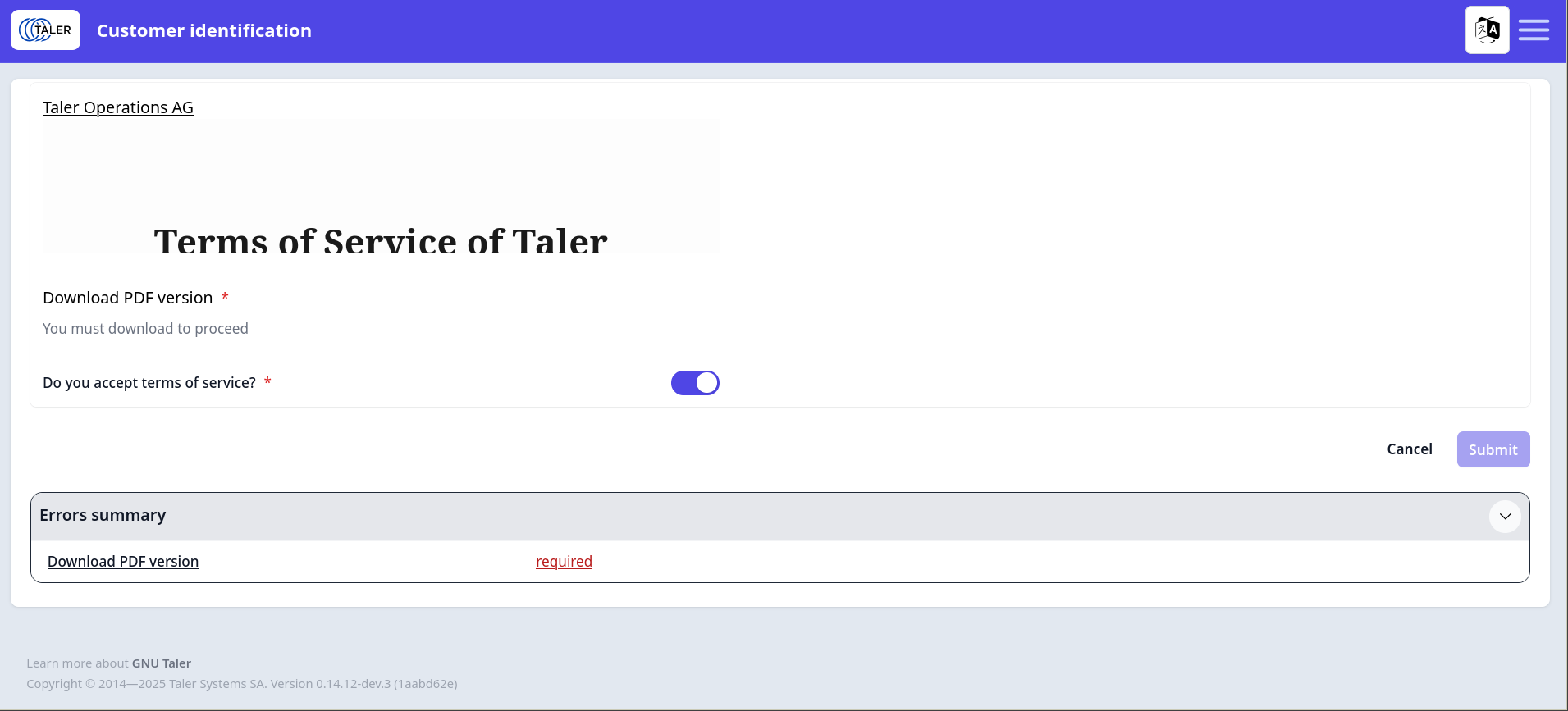 | Description | I get the "Errors summary" (starnge, should be Error summary) that "Download PDF version" is "required", but there is no download PDF button! Instead, we still have the (bad) inline ToS rendering (which I thought we said we would get rid of and replace with LINKS to the HTML + PDF versions). But anyway, I cannot get past the screen as I cannot satisfy the download requirement :-(. | ||||