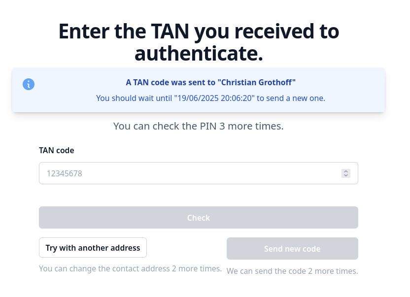 | Description | If I put the wrong address in the postal challenger (didn't try with SMS yet), and then in the PIN dialog want to change my address, I cannot. The button "Try with another address" is there, but does not work -- even though it seems sensitive. Note that the "Send new code" button is correctly disabled in the screenshot as it is too early. | ||||
