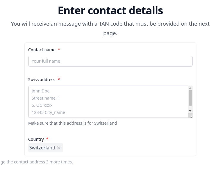 this is the updated form the country is disabled so it can't be changed the address label is now "Swiss address" with a helper below and the posted value { "attempts_left": 3, "type": "created", "address": { "CONTACT_NAME": "sebasjm", "ADDRESS_LINES": "this is my\nch addr", "ADDRESS_COUNTRY": "CH" }, "transmitted": true, "retransmission_time": { "t_s": 1746512261 } } |